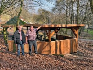 Foto: Neues Dach und Seitenwände am Grillplatz im Wiebesiek. Hans-Dieter Bähr und Wilfried Gerkensmeier von der Vereinsgemeinschaft freuen sich über den neuen Holzbau.